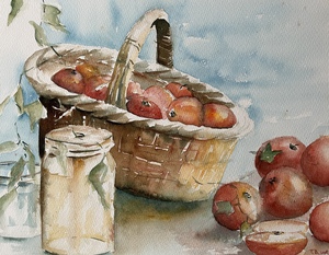 1996Mand met appels, aquarel met passe-partout in de maat 60x50 cm
