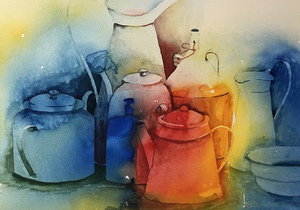 2002Stilleven met diverse kannen, aquarel met passe-partout in de maat 60x80 cm