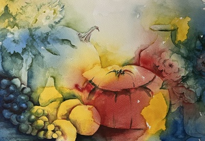 2001Pompoenen, aquarelschilderij inclusief passepartout en professionele aluminium wissellijst.