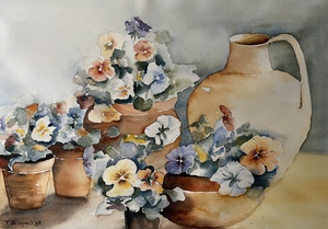 1998Kannen en kruiken een aquarelschilderij met viooltjes inclusief passepartout en professionele aluminium wissellijst.